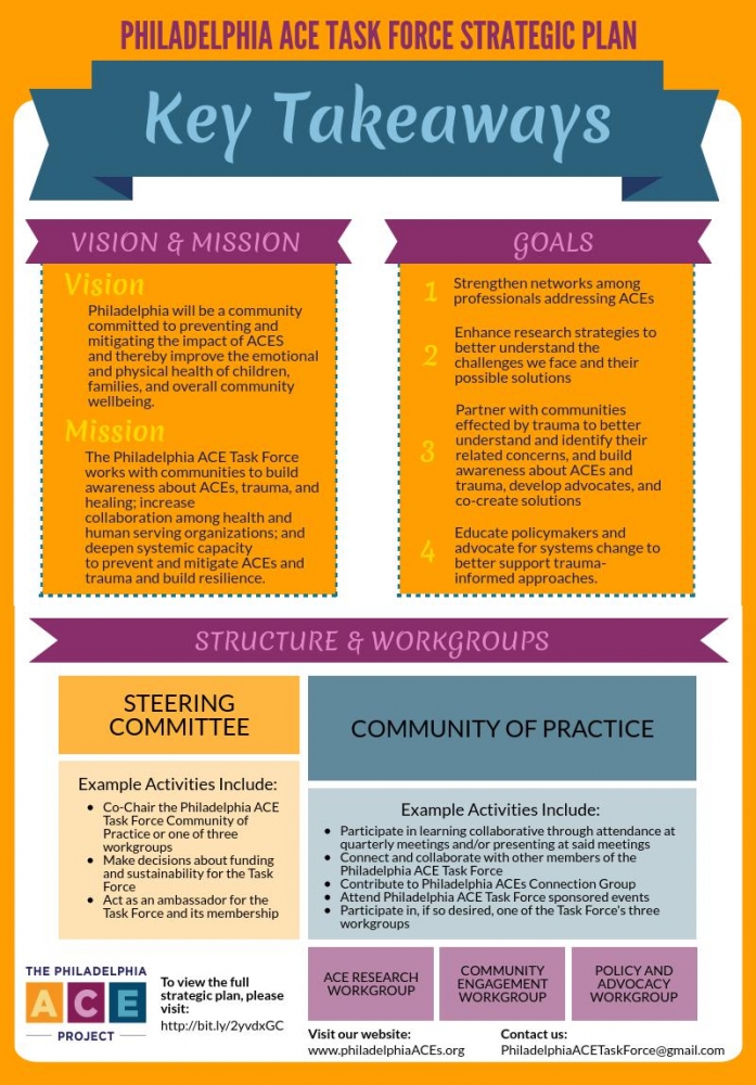 In January 2017, the Philadelphia ACE Task Force Steering Committee embarked on a journey to create a new strategic plan for the Task Force, incorporating guidance from the full membership of the Task Force. The new Strategic Plan was vetted with the full task force in June 2017, with final feedback given. In 2018, the Task Force is implementing the plan, which includes a new set common goals, activities, and structure. Below is an infographic and also a link to download the plan.
